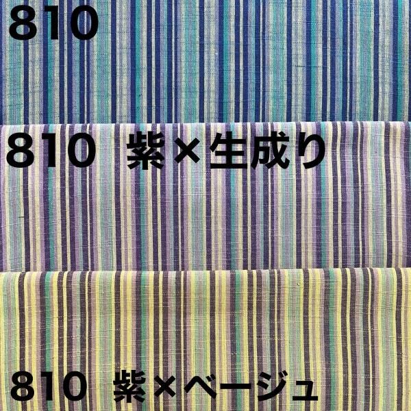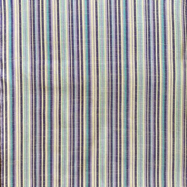 よこ糸がベージュの織られています。黄色みのある白、紫、グリーンの縞柄。
