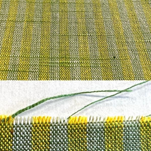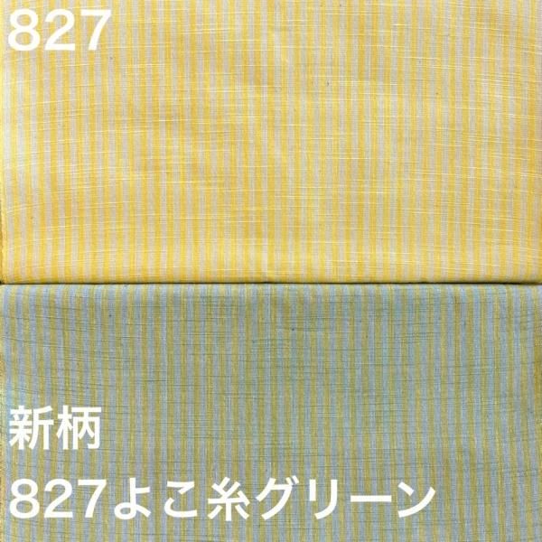 827の黄色の棒縞のよこ糸違い。よこ糸は、グリーンです。