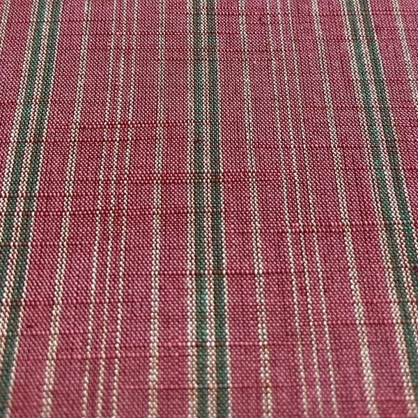 濃いピンクと細いグリーン、生成り色の線の縞です。