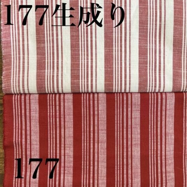 経糸が生成り、緯糸が赤で織られています。茶の縞です。